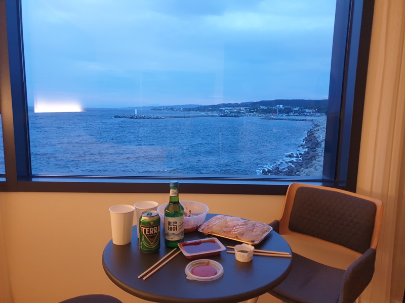 객실의 색감은 개인 취향에 따라 다를 수 있는 부분이지만 저는 하얗고 깨끗한 방을 보면 기분 좋은 포근함이 느껴지기도 합니다. 비록 방은 넓지 않지만(둘이 충분하긴 합니다) 넓은 바다 뷰 때문에 개방감이 있습니다. 통일성이 없는 저 의자에도 객실의 첫인상 때문인지 감성적으로 느껴지네요.